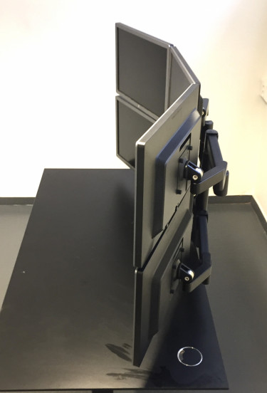 Artikkel nr. 640016-0Skjermarm som frigjør bordplass. Solid og rent design. Løsningen kan bygges om fra 6 og ned til 4 eller 3 skjermsløsning. Spesielt beregnet for overvåkningsplasser.