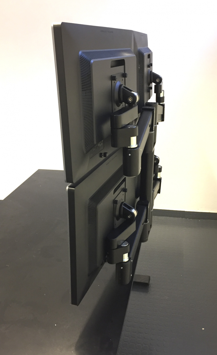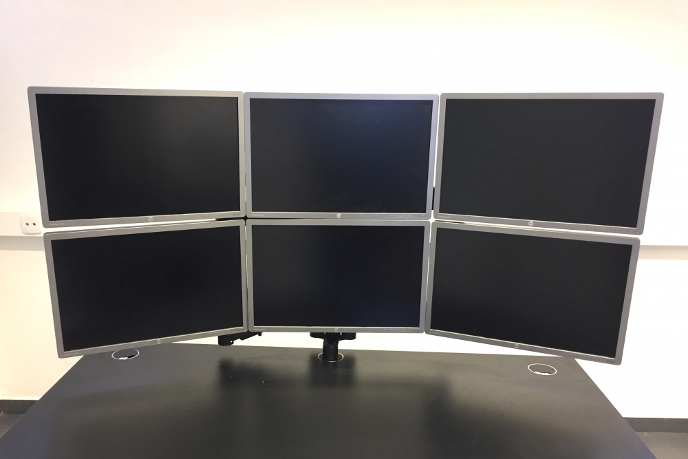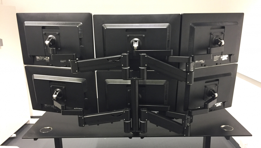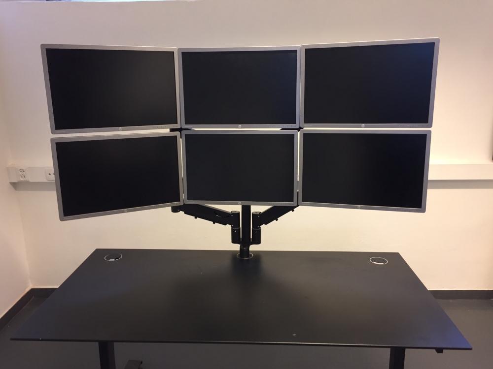 Space Origo System 6-skjermsløsning passer skjermer med vekt fra 3-7 kg. Skjermene kan posisjoneres midt på bordet og innstilles uavhengig av hverandre. Skjermarmene kan låses fast i ønsket høyde. Det unike origoleddet og festet gjør det mulig å få skjermene helt inn til bordkanten, selv med skjermer av ulik størrelse og ulik høyde.