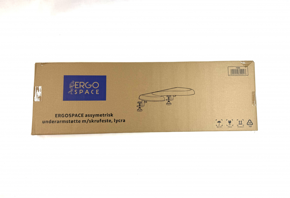 Ergospace asymmetrisk underarmstøtte er selve innsvingen/buen sentrert midt på bokstavdelen til tastaturet, slik følger kanten i buen kroppens form og gir lik støtte til begge armer. Underarmstøtter gir støtte og avlaster nakke, skulder og rygg. Det er i tillegg ofte behov for underarmstøtte for å oppnå bedre avstand til skjerm. Festes med bordklemmer.